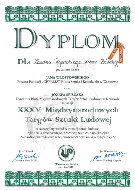 Dyplom Prezesa Fundacji "CEPELIA" za szczególny wkład w rozwój sztuki Ludowej w Krakowie. Warszawa - Kraków, sierpień 2011 r.