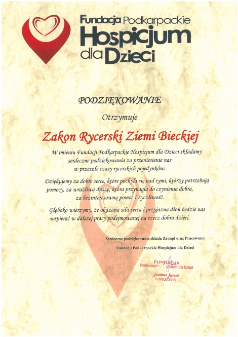Podziękowanie Fundacji Podkarpackie Hospicjum dla Dzieci za bezinteresowną pomoc i życzliwość. Rzeszów, kwiecień 2012 r.