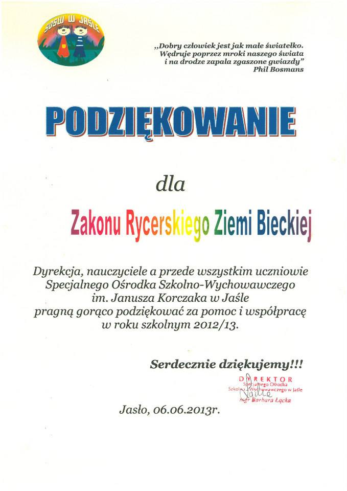 Podziękowanie Specjalnego Ośrodka Szkolno-Wychowawczego im. Janusza Korczaka w Jaśle za pomoc i współpracę w roku 2012/13. Jasło, czerwiec 2013