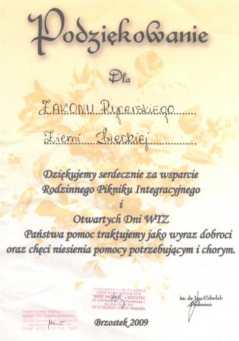 Podziękowanie za wsparcie Rodzinnego Pikniku Integracyjnego i Otwartych Dni WTZ w Brzostku. Brzostek, 2009 r.