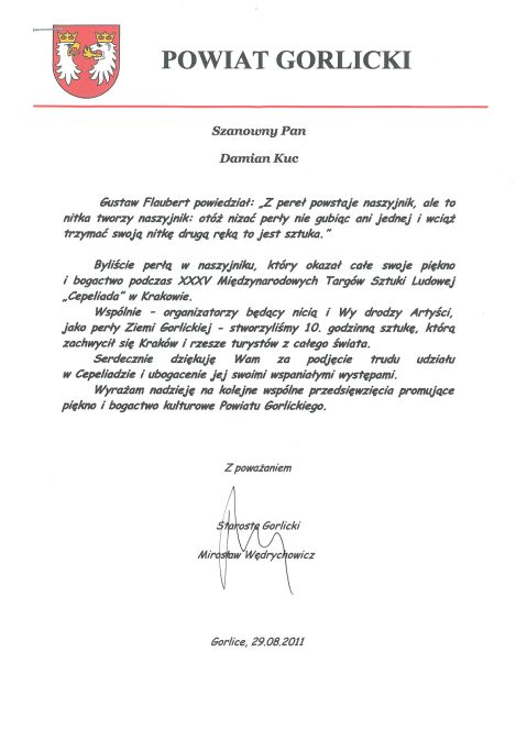 Podziękowanie Powiatu Gorlickiego za udział w XXXV Międzynarodowych Targach Sztuki Ludowej "Cepeliada" w Krakowie. Gorlice, sierpień 2011 r.